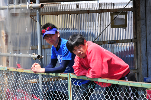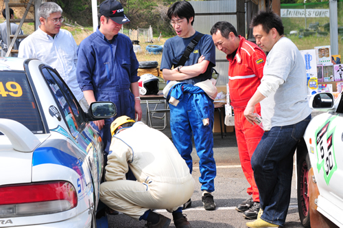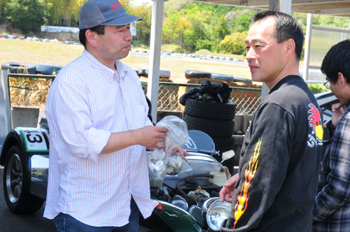 左:見た目と裏腹に過激で繊細なドライバー、石垣。右:チーム福王事務局長、谷さん。
