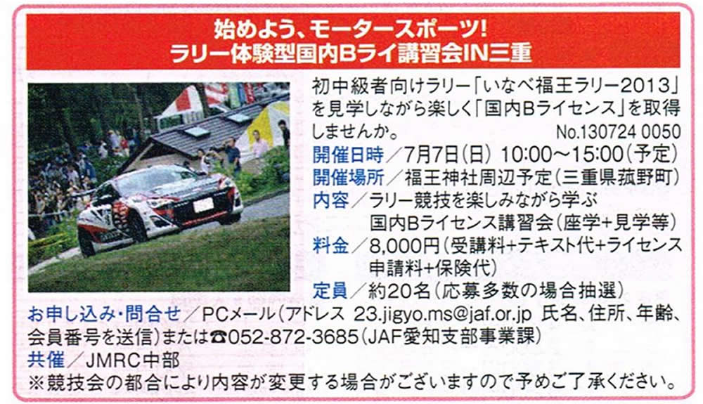 いなべ福王ラリー2013を見学して、B級ライセンスを取りませんか、という企画が行われます。 こちらはJAFが主催、JMRC中部後援となっております。お問合せ等、詳しくは下記まで。 ※JAFMATE 6月号掲載記事の抜粋です。クリックで拡大します。