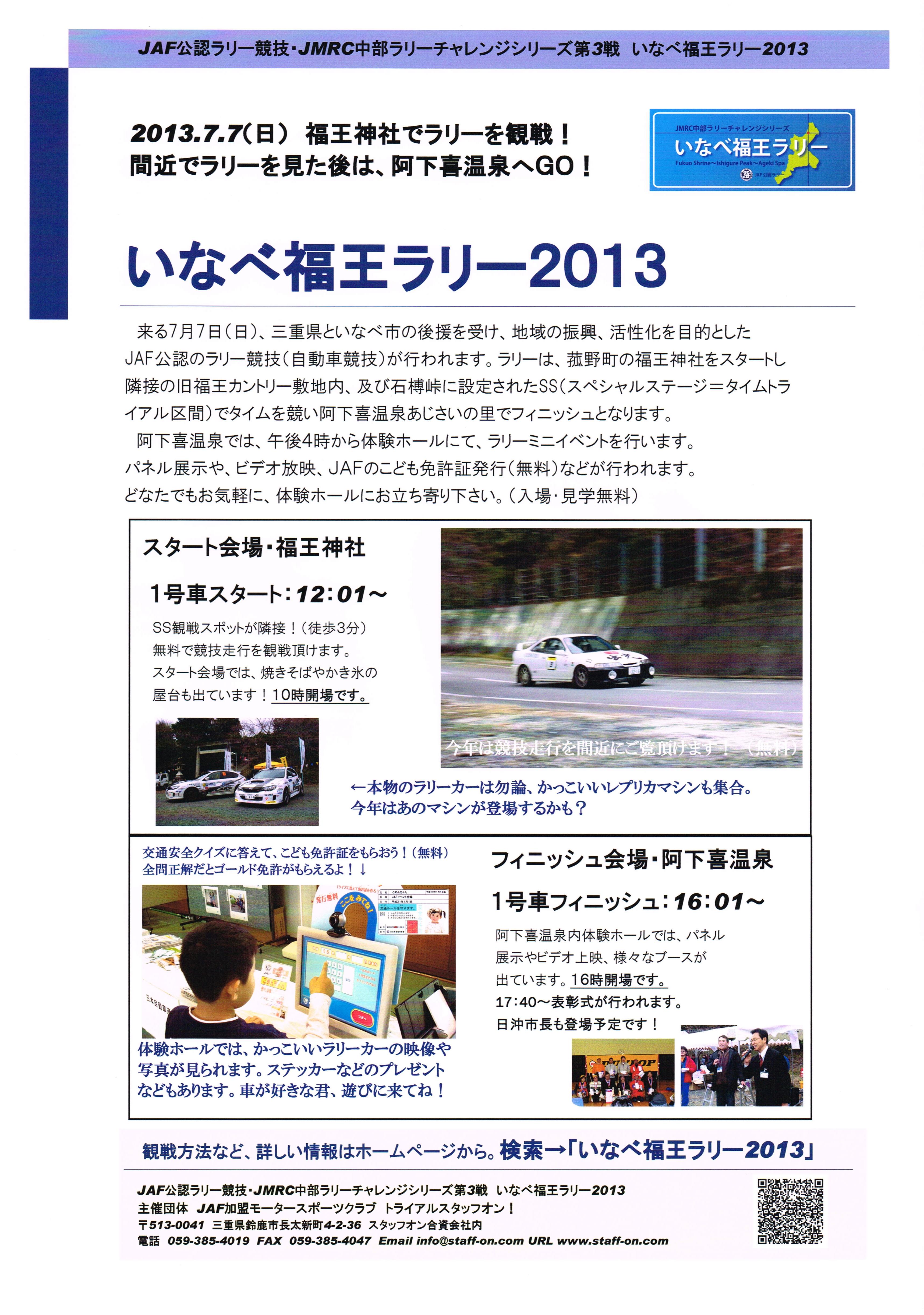 ☆オフィシャル・ボランティア募集! 専用ページ(※オフィシャルは必ず確認の事!興味のある方もどうぞ) いなべ福王ラリーは誕生からまだ1年未満。主催クラブも運営について、勉強の日々です。 ラリーという競技、文化を盛り上げて、次世代に繋いで行きたい、という思いで頑張っています。 ラリーを開催する為に、本来はエントランントとして出場出来る人が、オフィシャルのお手伝いを 頂いている。この為、参加台数が減少して、イベントとして盛り上がらない、という悪循環を 断ち切りたい。そんな思いから、エントラントでは無いオフィシャルの方を求めています。 特に、ライセンスや審判員資格、経験の有無は問いません。年齢、性別もです。 ラリーや車、モータースポーツが好きな方なら、どなたでも歓迎です。 興味のある方は、是非、ご連絡下さい。 メール info@staff-on.com