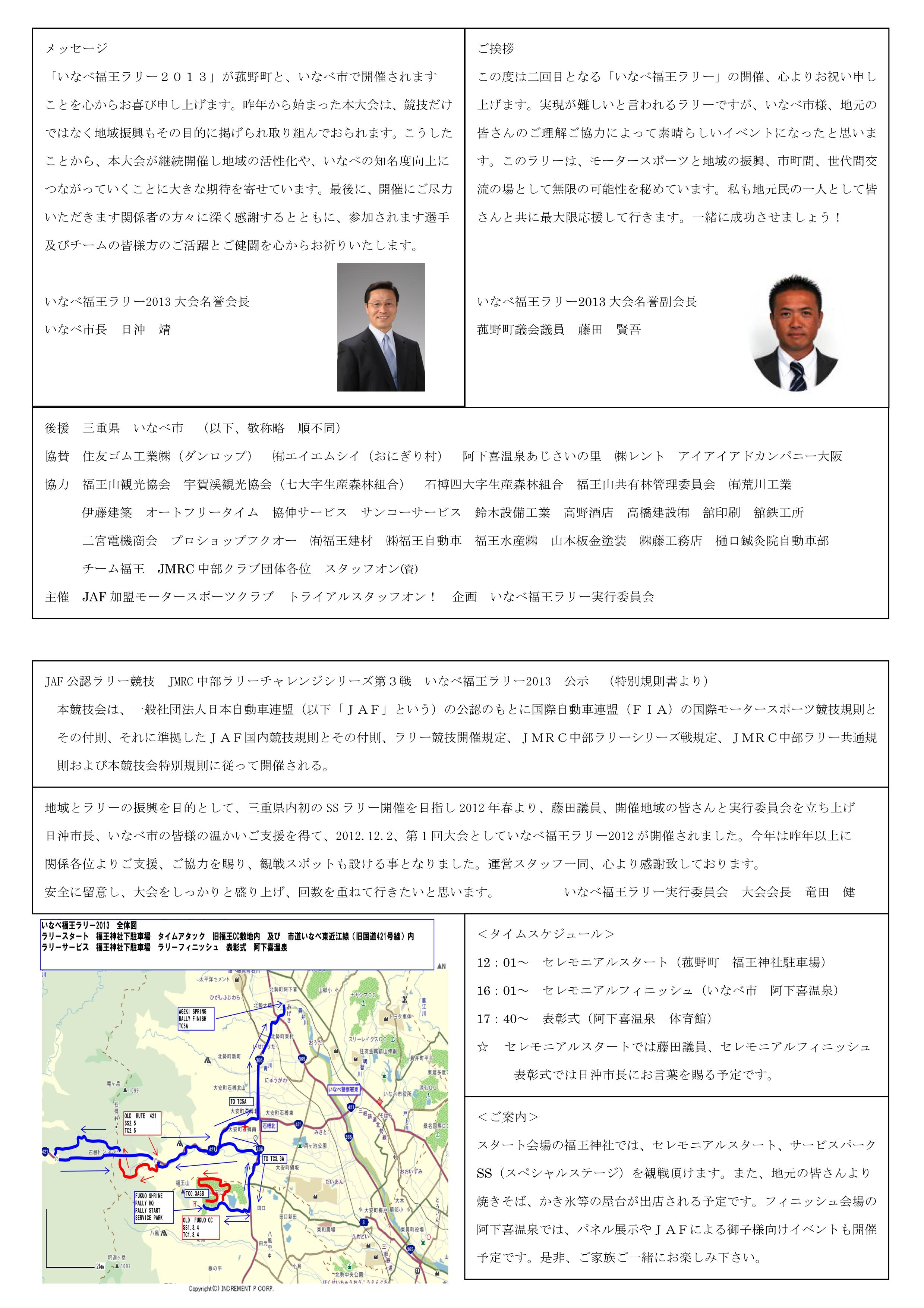 2013.6.28 福王新コース、整備後の試走動画掲載 2013.6.28 コミニケーション4掲載(コミニケーション2の訂正 重要、参加者必読の事) 2013.6.20 コミニケーション3掲載(CRO決定) 2013.6.19 オフィシャル専用ページオープン 下段 2013.6.17 プログラム表面 誤字訂正 観戦図改訂 観戦ガイド改訂 2013.6.13 ポスター プログラム 掲載しました。(容量の都合でJPEGです。印刷してご覧下さい。) 2013.5.30 コミニケーション2掲載 (レッキ実施概要です。) 2013.5.30 コミニケーション1掲載 (サービス登録費用等決定しました。これでお申込頂けます。) 2013.5.27 SS1.3.4コース内動画公開・公式通知1 アイテナリー改訂版掲載 2013.5.22