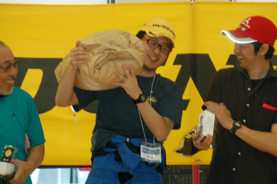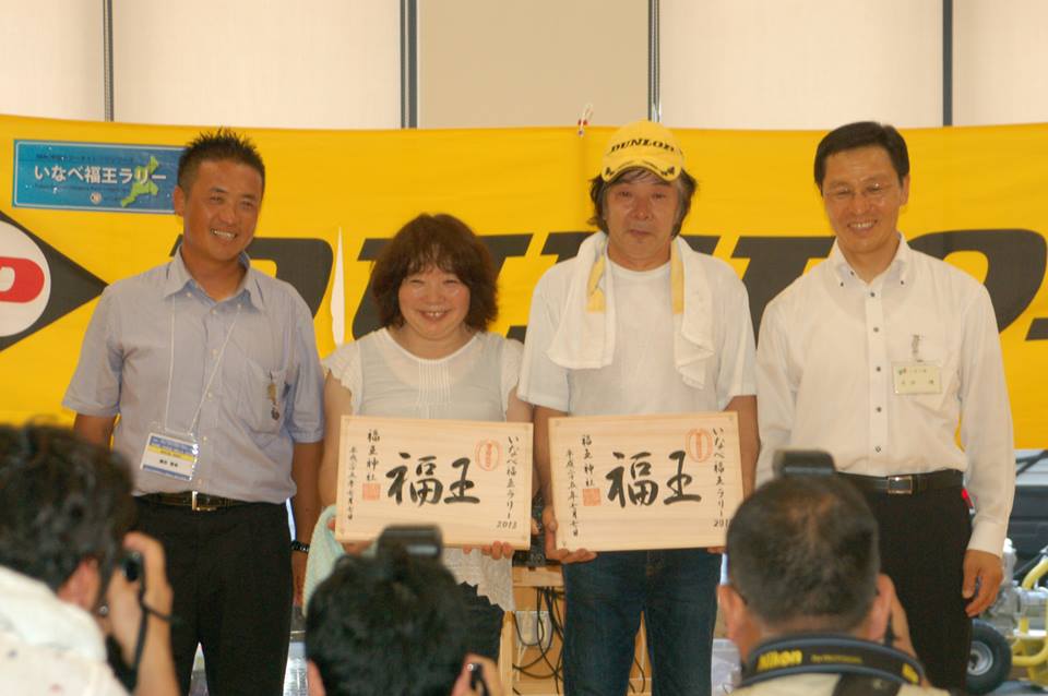 ↑今回のチャレンジクラス優勝クルーのドライバー松田選手 (左)はなんと67歳!ペースノートに忠実にミスコース無く 走りきって優勝。賞品はなんと地元協賛企業からのお米が 30キロずつ。コドライバー(助手席の選手)は頑張って 担ぎました!