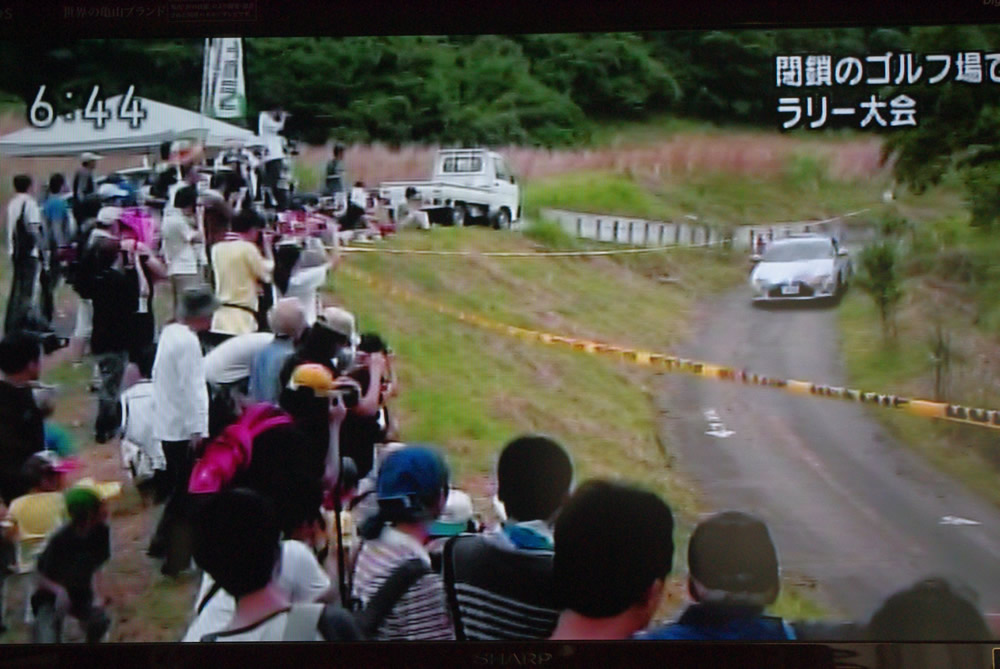 ↑「NHK:「ラリーを終えて、どうですか?」 阿下喜温泉の駐車場にてインタビューを 受けました。見ての通り、もう半ば逝って しまっておりますが…