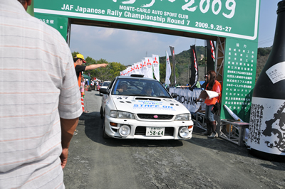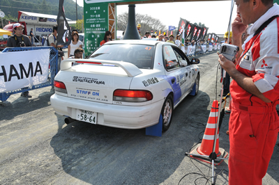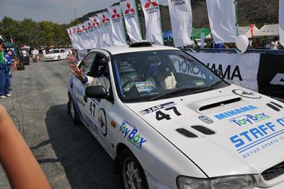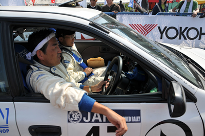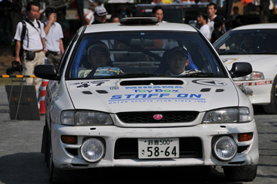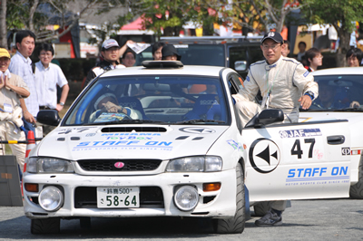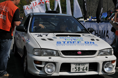 新城ラリー凱旋記 その3 <出走その2> この写真、かっこよくないですか?私は作業現場でダウンしたオジサン状態ですが・・・ なんだか速い車に見えてきました。不思議。 とても沢山の声援で、大感激。新城ラリーならではです。 タオルで頭を締めてます。とにかく暑くて・・・ 得意なはずのトーク、緊張で崩壊。 ギャラステの不安で爆発寸前。 何故か痛車対決に混ぜられてしまいます。 いざ発進。 <SS1>へ続く 「君にも取れる。国際C級ライセンス入門」 まえがき に戻る モータースポーツトップ に戻る