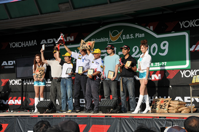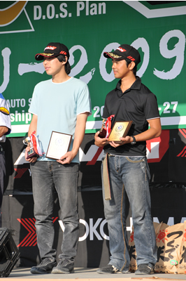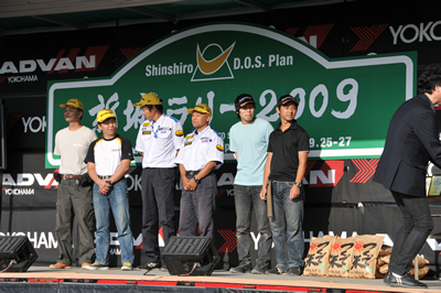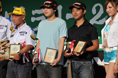新城ラリー凱旋記 その6(仮) <表彰式その2> 選手権JN1.なんとデン、イト3位入賞! ううむ、凄すぎる・・・ JAFの盾。 そしてカップまで! 少し照れている?なるほど、帽子は表情を隠します。大人のアイテムだ・・・ ほら、イトちゃんのこのにやけ顔!それにしてもうちのクラブからここに立つ人が出てくるとは。 <サービスにて>へ続く 「君にも取れる。国際C級ライセンス入門」 まえがき に戻る モータースポーツトップ に戻る