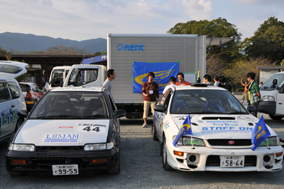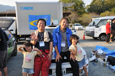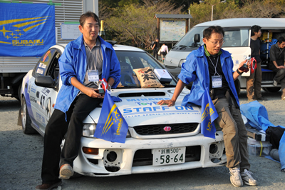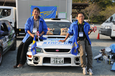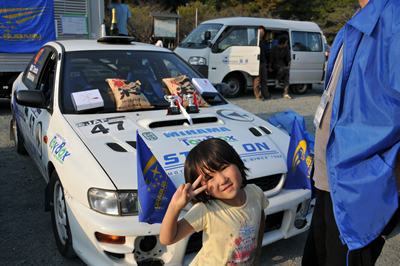 新城ラリー凱旋記 その7(仮) <サービスにて> 表彰式終了後、サービスにて。 戻ると適当なスバルブースに・・・ そして記念撮影。よかったよかった。 ああ、疲れました・・・ 三女が撮影を希望した模様。 二人とも、いい顔だ!おめでとう! 本当に沢山の仲間に助けられました。心から感謝!!! 近いうちに参戦記の続きを・・・書きます。とりあえず、特集トップへもどる。 「君にも取れる。国際C級ライセンス入門」 まえがき に戻る モータースポーツトップ に戻る